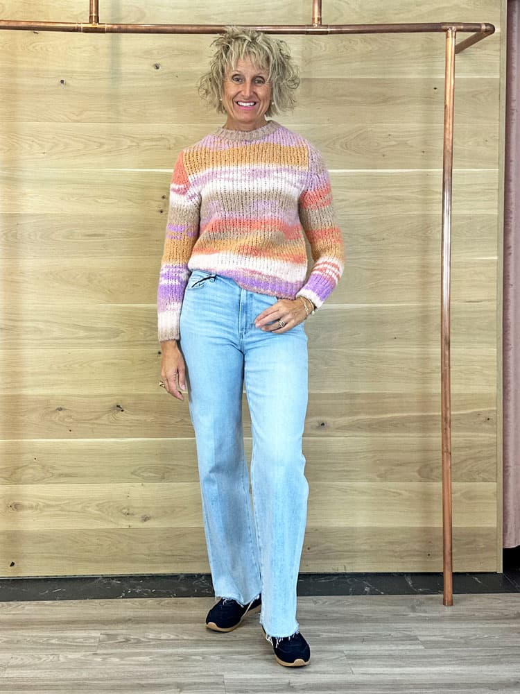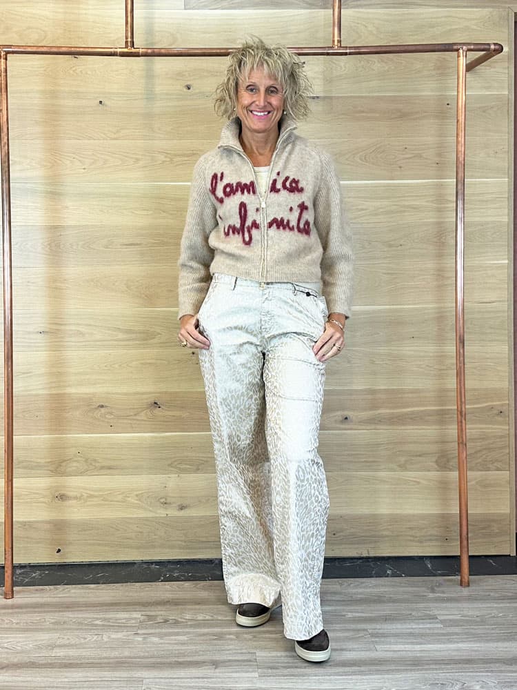 STYLE NOTE: The mesh sleeves on this Rino & Pelle knit are artfully adorned with beautiful flower embroidery, adding a touch of whimsical charm!