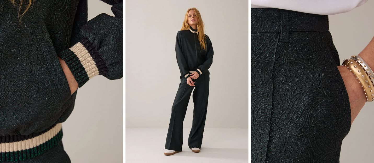 STYLE NOTE: This co-ord set from Summum is made from a rich glitter jacquard fabric that catches the light beautifully! The jacket also has tricoloured knitted cuffs, hem and neckline with lurex detailing too.