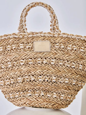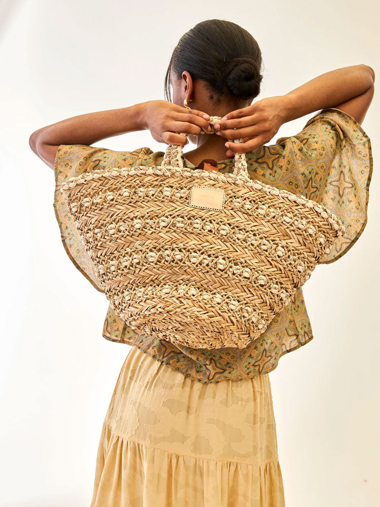 Nekane raffia and lurex tote bag. Top handle. Lined interior. Snap button and zip closure.