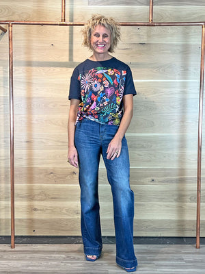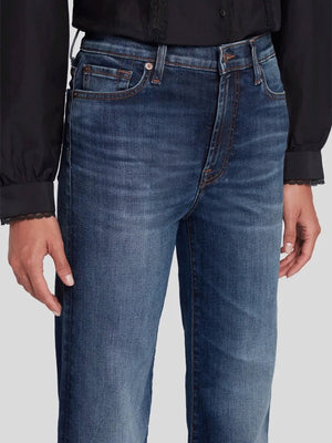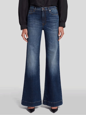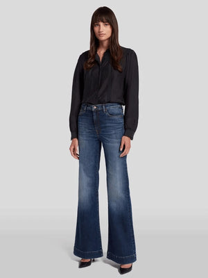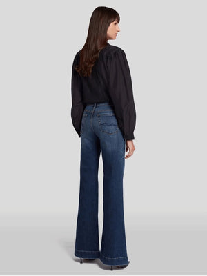 The Modern Dojo is defined by a high waist and sweeping, flared legs. These staple jeans return for the new season in dark blue Heritage denim, finished with artful fading and whiskering.