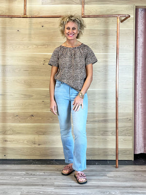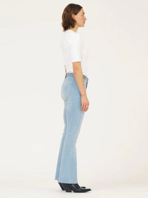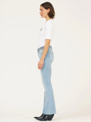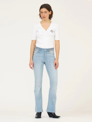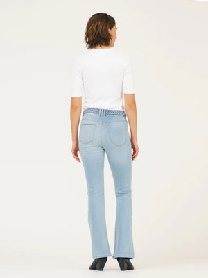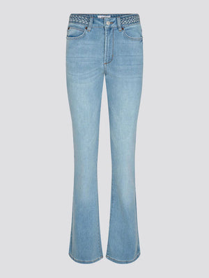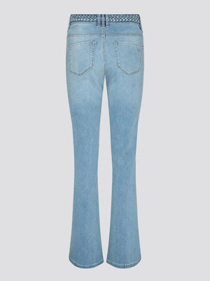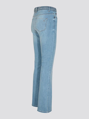 This is a light blue denim colour with a slightly worn effect on the thighs and a cool braided belt detail at the waist. It has five pockets and a button closure, a high waist, a slim fit and a flared leg.