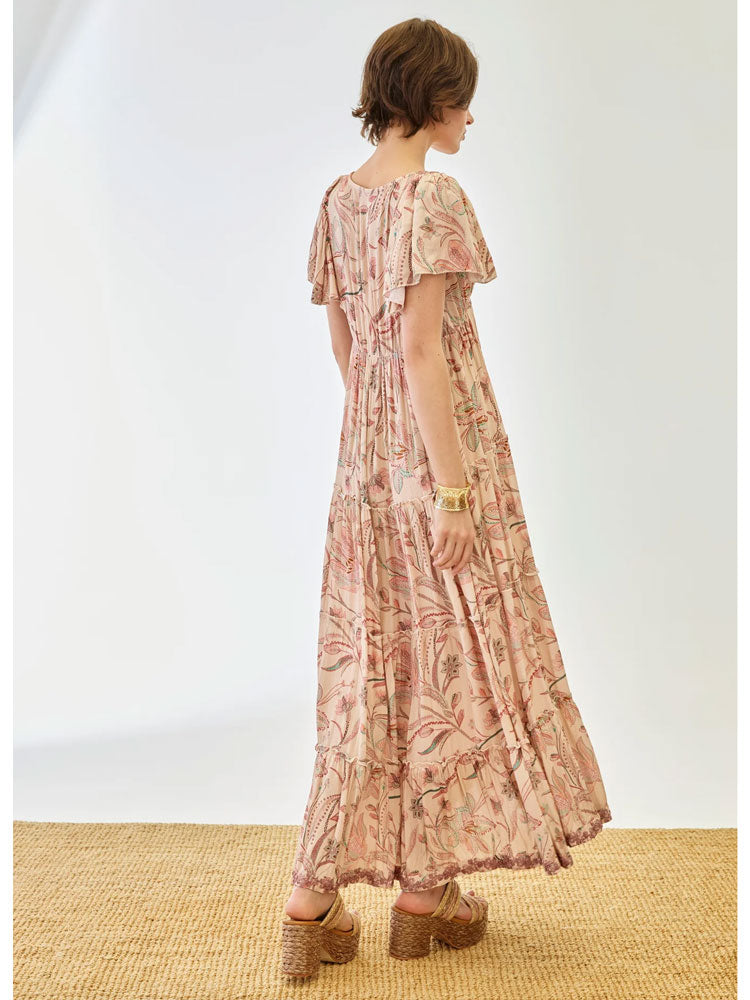 Long floral print dress with short ruffled sleeves. Sequin embroidery detail at the neckline and ruffled hem.