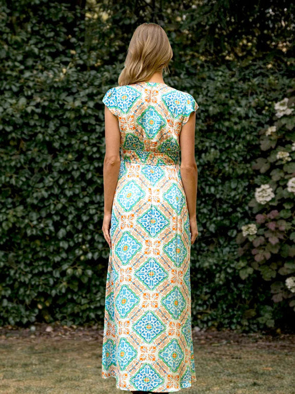 Crafted in fluid modal, the Caravan Dress is inspired by traditional tile motifs reimagined in a warm orange palette. Light and airy, it drapes beautifully while offering comfort and movement. Designed with an adjustable waist and a flowing silhouette, it brings an effortless elegance to relaxed, sun-filled days.