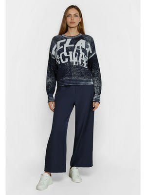 This cotton sweater features a sporty print. Toned stripes on the sleeves and hem add a modern touch, while a fine shiny thread subtly enhances the design. The classic round neckline makes it a versatile companion. Perfect for a casual yet trendy look.