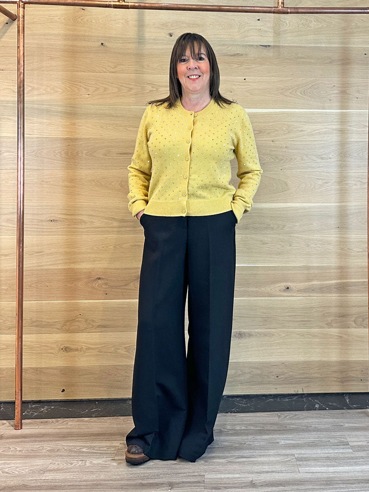 Beautiful, soft cardigan with elegant silver-coloured studs. The cardigan features a classic round neckline, long sleeves, and a front button closure.