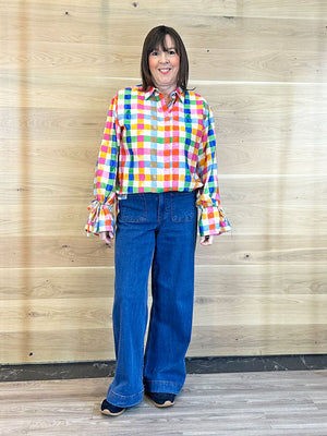 This blouse features a colorful squared pattern, perfect for casual days. Lightweight and comfortable, it adds a cheerful pop of color to any outfit while keeping your look fresh and effortless. Pair it with shorts, linen pants, or a simple skirt for relaxed styling.