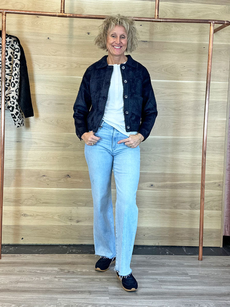 Indulge in the luxurious softness of the Bubbly jacket. Made from our signature material, this short jacket is a must-have addition to your wardrobe. This short jacket features a contemporary boxy silhouette, a flat collar, a button closure, two open front pockets, a button closure on each cuff and button details on the back. Elevate your wardrobe with this exquisite piece that effortlessly combines luxury and practicality.