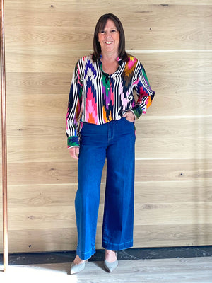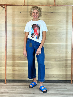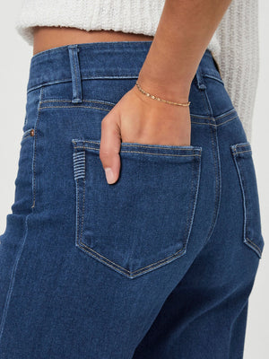 This modern ultra high-waisted wide leg has an easy, relaxed fit and an ankle-length silhouette.