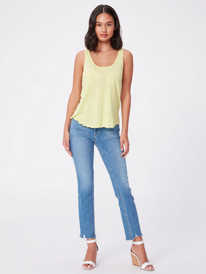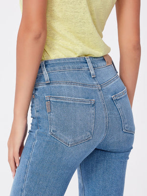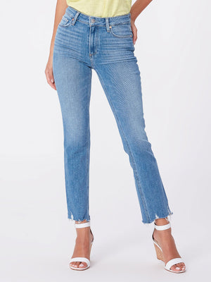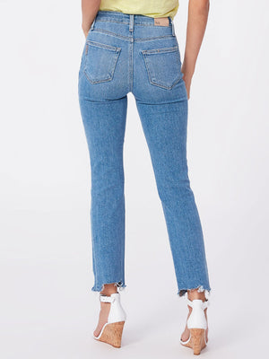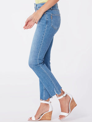 This high-rise, perfectly straight jean is lean through the leg and finishes at the ankle with a raw, destroyed hem.