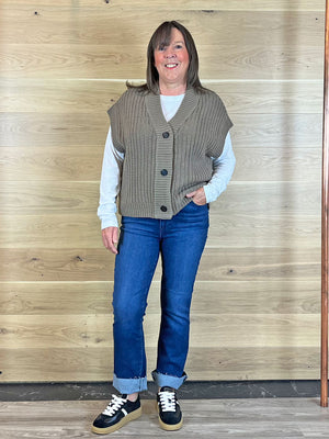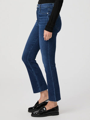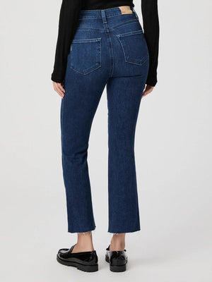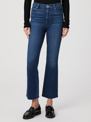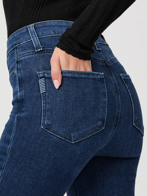 This high-rise ankle flare comes in a bright dark wash with tonal thread and a raw hem.