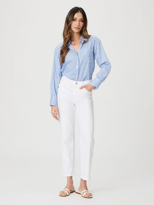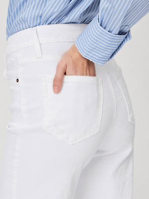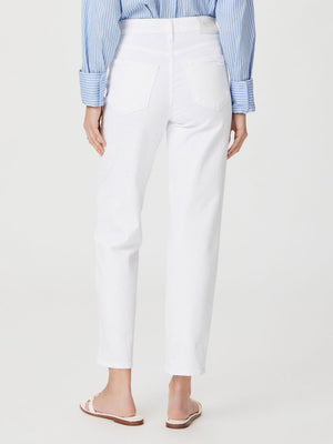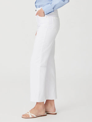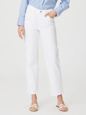 A true straight leg with a high-waisted silhouette and a cropped ankle length.