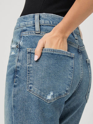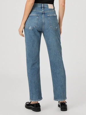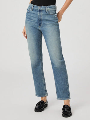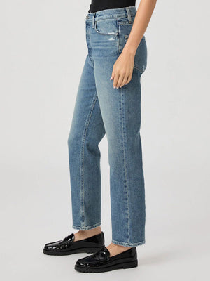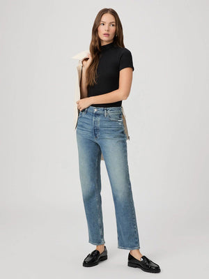 A vintage-inspired high-rise straight-leg silhouette with an ankle-length inseam. They are cut from PAIGE VINTAGE denim in a tinted vintage-inspired light wash with subtle lived-in details, silver polished hardware, and a raw hem