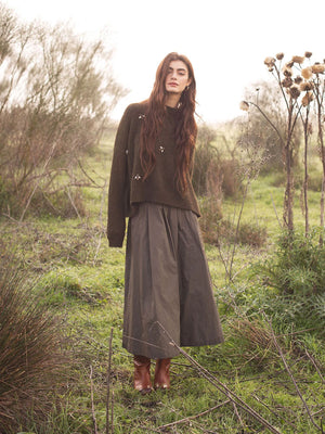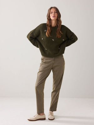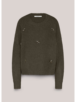Oversized boxy jumper made of a soft yarn and decorated with stitched insect-shaped brooches. The jumper has a lowered sleeve inset with narrow sleeves.