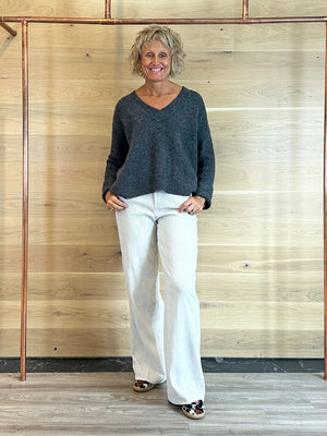 This sweater combines a modern V-neckline with a cozy alpaca-wool blend. Ribbed details and dropped shoulders add a relaxed touch. Perfect for a casual yet trendy look.