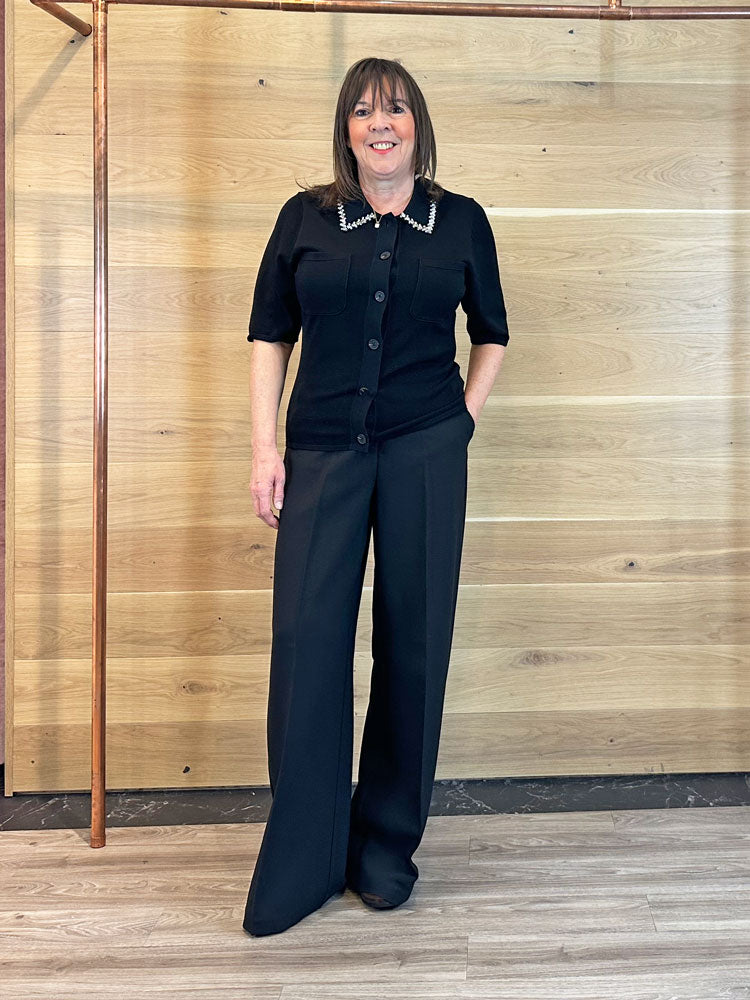 The Vigga Rhinestone Polo Knit merges everyday comfort with a touch of glamour. Designed in a structured knit with a polished button-up front, this short-sleeved piece is elevated by rhinestone embellishments along the collar and chest pockets.