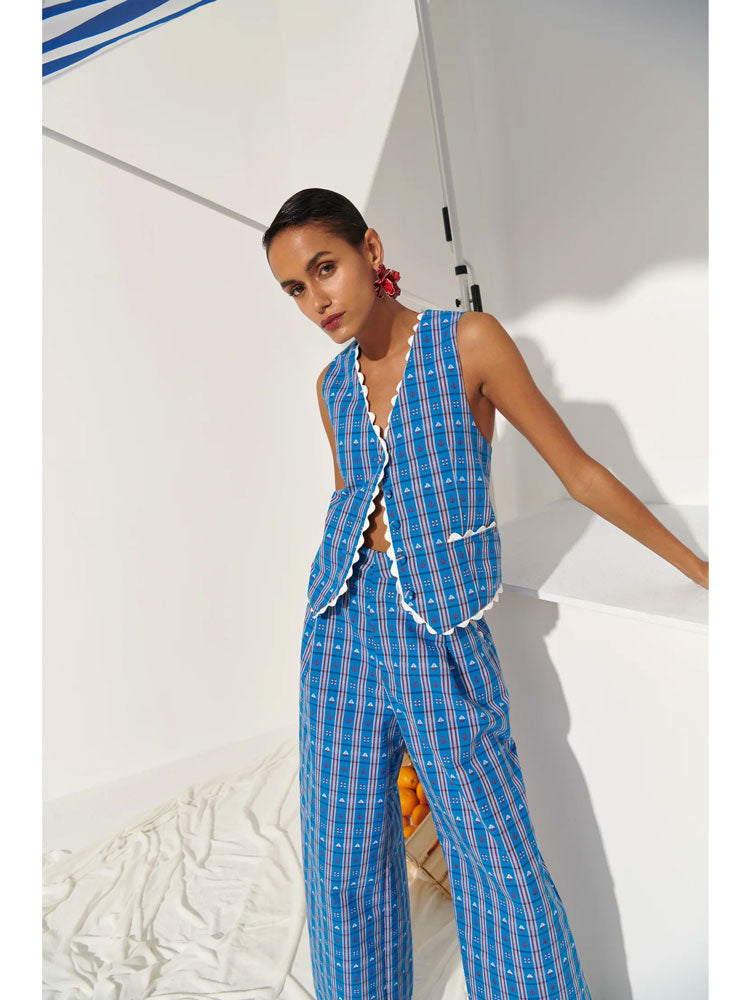 The Alicia Vest blends tailored structure with playful charm. With a deep V neck it's crafted in a vivid blue plaid and finished with white scalloped trim, it fastens with statement buttons down the front.