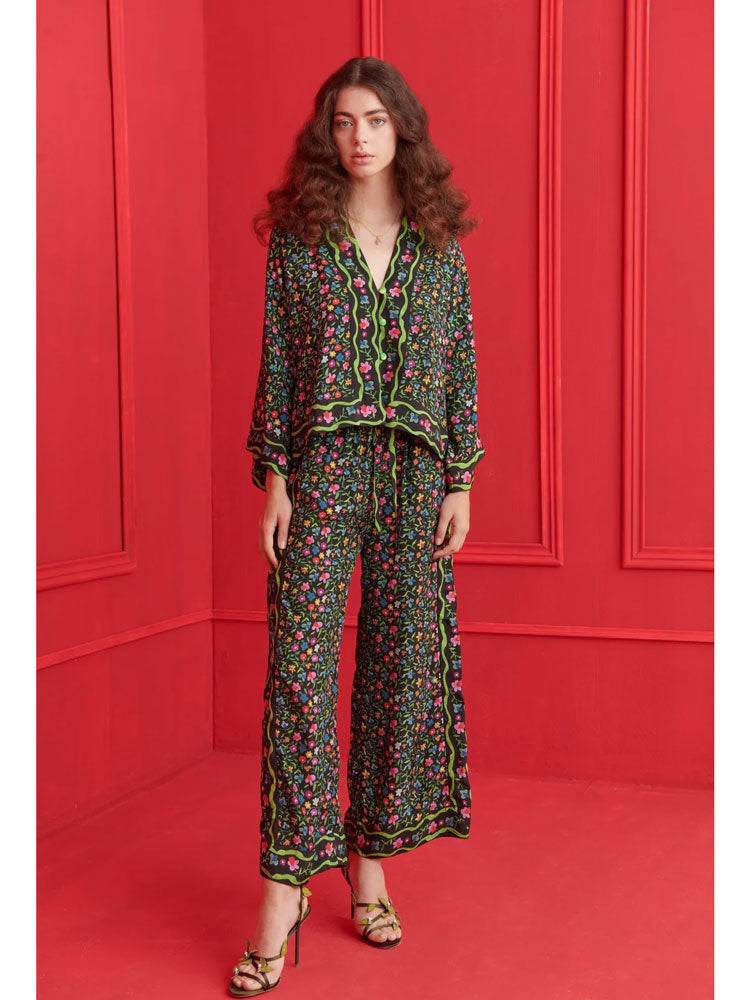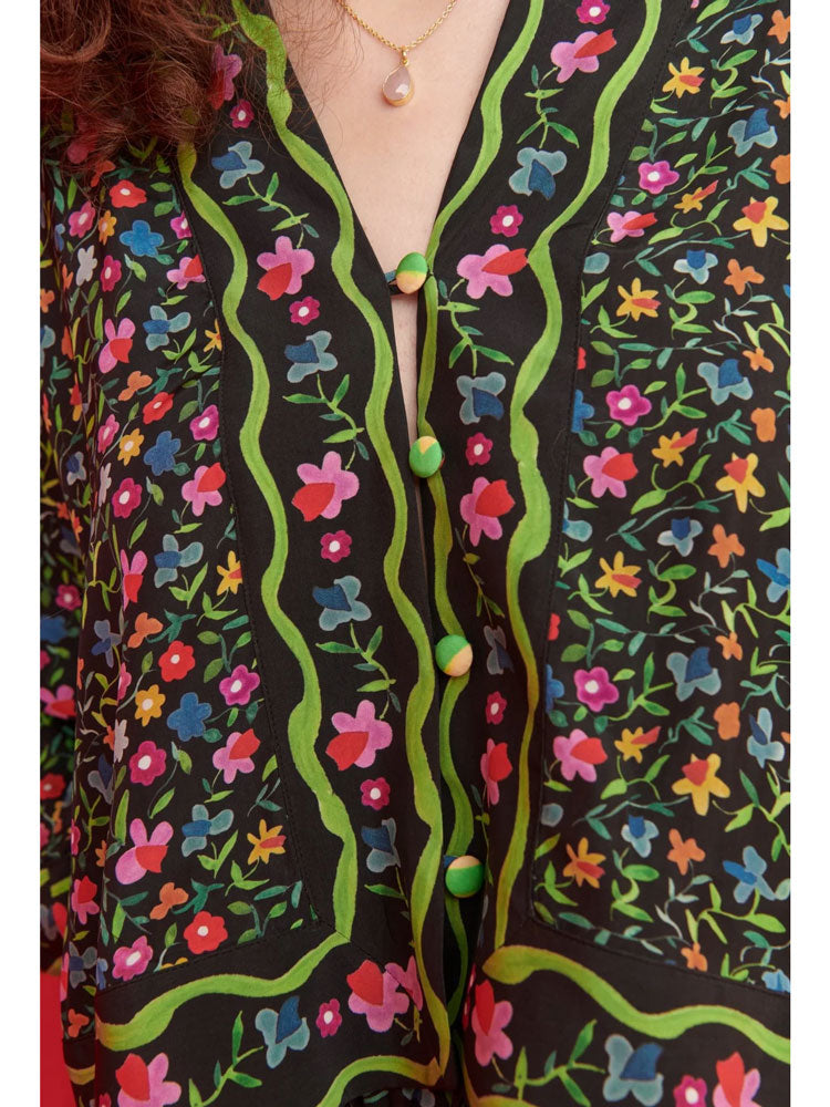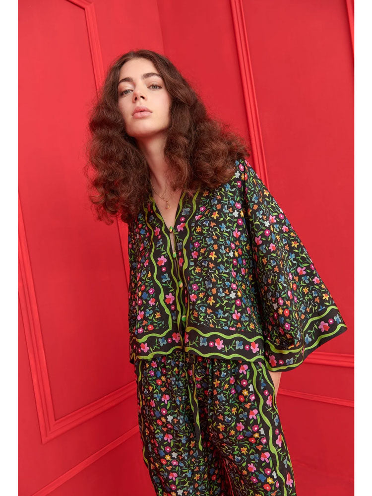 An elevated take on relaxed dressing, the Hala Top blends a flowing silhouette with botanical charm. Designed with wide sleeves and a V-neckline button-down front, it features a lush floral print bordered by vibrant green and fuchsia lines that draw the eye to the midnight-black base. Pair it with the matching Hala Pants for a complete, head-turning look.