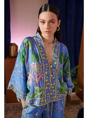 The Noche Top is your go-to for laid-back glamour. Inspired by celestial dreams and tropical escapes, the relaxed-fit kimono top is crafted from silky fabric. The deep blue base is adorned with lush palms, pink florals, and a golden border of stars and moons. Wear it as a statement set or mix and match for effortless elegance — perfect for slow mornings, sunset cocktails, or starry nights in.
