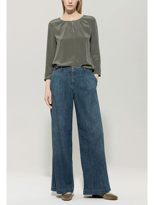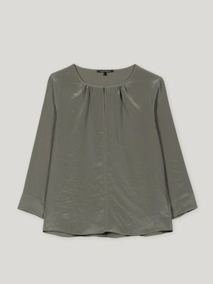 Blouse shirt made from flowing, recycled techno silk with a dividing seam on the front. The round neckline has a button fastening. The 3/4-length sleeves end with a one-button cuff.