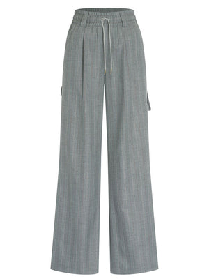 These grey wide leg trousers are made from a soft viscose blend with stretch to offer maximum comfort. The fine striped pattern creates a classic look, while wing pockets and cargo pockets offer practical details. The drawstring with eyelets on the waistband allows for a custom fit.