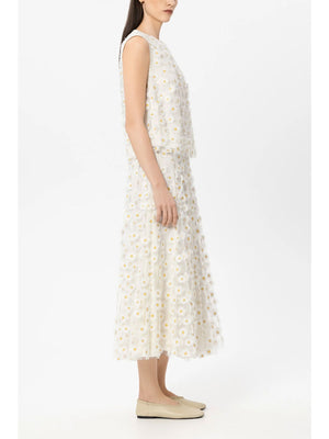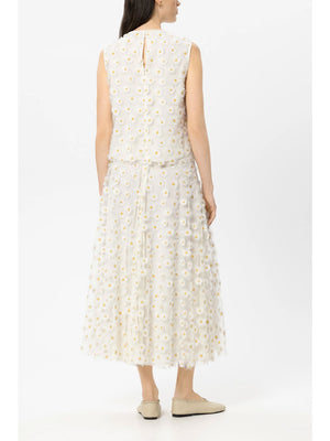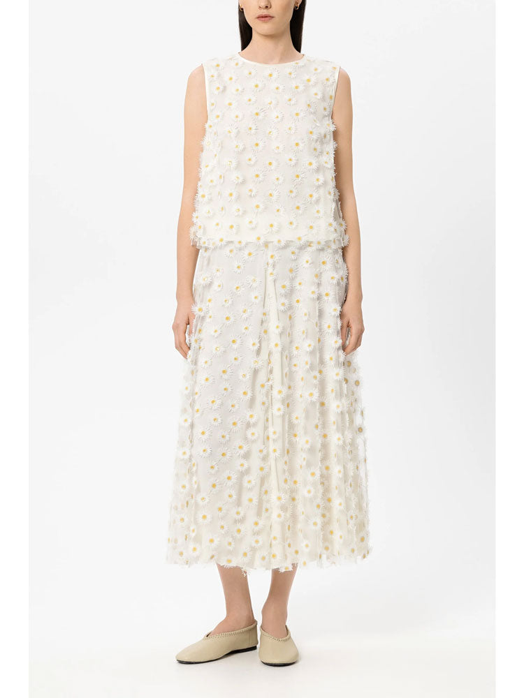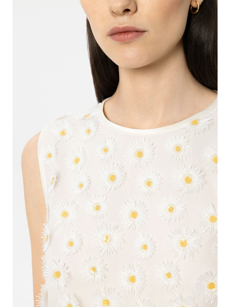 Straight-cut blouse top with a round neckline and button fastening at the back. This summery top features intricately appliquéd 3D margarites on opaque lined tulle.