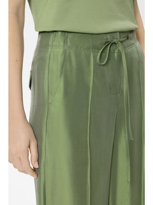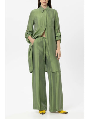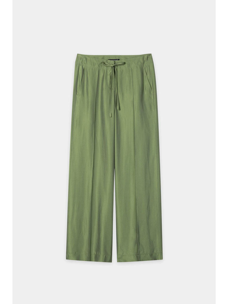 Wide jogging trousers made of an elegant iridescent viscose/silk blend with creases, two slit pockets and two fake pockets with flaps. The waistband can be adjusted with a drawstring.