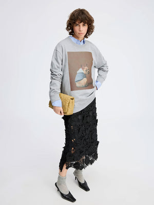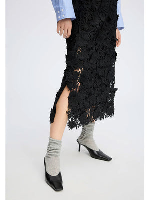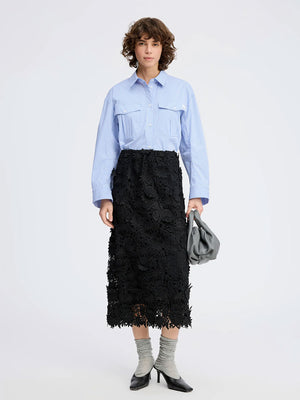 Elegant black skirt with beautiful floral appliqués. Designed with a black lining and partially sheer details at the hem and side, it fastens with a side zipper.