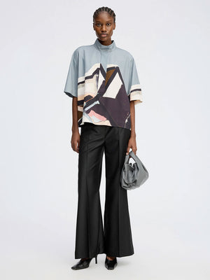 A beautiful shirt blouse with an elegant art print. It is designed with short sleeves, can be opened halfway down, and features a small collar with a fine button closure detail. The blouse has a loose fit.
